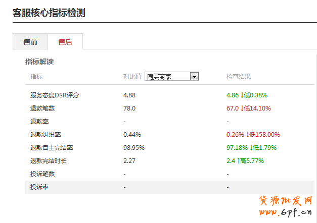 如圖,可以看到這個店鋪現在領先6%的同行商家,所以它的售后綜合指標得分就是1-6%=94%。一般來說,領先同行商家越多,售后綜合指標得分就越低。領先的同行賣家越多越好,也就是說,售后綜合指標得分越低越好。目前淘寶最最最底線,報名天貓官方活動的最低要求,是售后綜合指標得分小于等于90%,即我們要領先10%以上的同行商家。