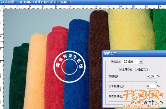 8、創建文字變形,選擇樣式為扇形,水平,設置彎曲度為100%,這里彎曲度根據圓環的形狀自定義數值。