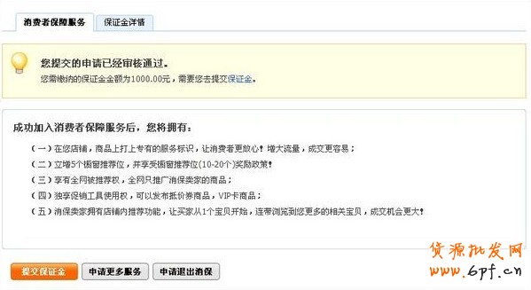 5、一旦您的審核被通過,您就可以在“我的淘寶”-“消費者保障服務”中看到“提交保證金”這樣的提示: