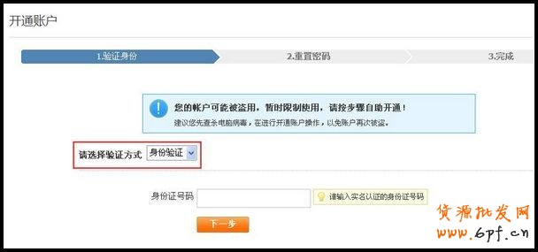 提醒:賬戶被盜開通的驗證方式有身份驗證、郵箱、密保問題、手機等方式,為了確保您的賬戶安全,系統會根據賬戶安全情況給予不同的驗證方式。