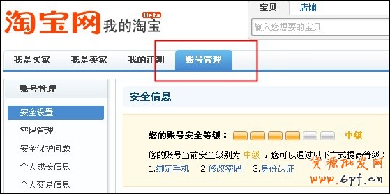 第一步:登錄“我的淘寶”頁面,找到“賬號管理”頻道: