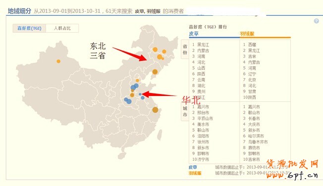 看上圖,羽絨服基本上在國慶節就開始有需求了,而皮草基本上也是國慶開始有需求。我們來看看國慶前后都是誰在關注“羽絨服&皮草”。地域細分,從2013-09-01到2013-10-31之間的61天來查找搜索“皮草&羽絨服”的消費者。