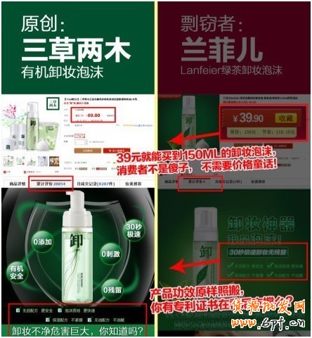 5月18日天貓化妝品類目賣家三草兩木發現當天的聚劃算一款蘭菲爾的寶貝盜了自己店鋪的圖片,于是在微博上拿出原圖和抄襲圖片的對比照片,引發了很多賣家的不滿和控訴,截止5月21日,該條微博轉發270次,評論190條。