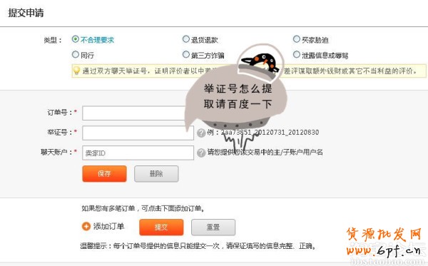 步驟五:填寫訂單號、舉證號、賣家的旺旺(不是買家)。