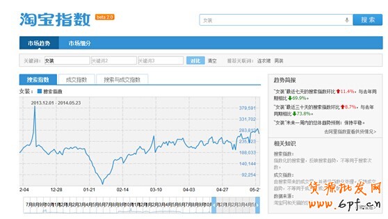 在市場趨勢當中,我們可以知道“女裝”的搜索指數,地域細分,以及人群定位的分析。通過這些數據來確定寶貝貨源的選擇,以及選擇哪個年齡層面的服裝比較適合。