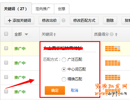 答:在管理推廣中的寶貝頁面,進入關鍵詞管理頁面,您可以逐個修改關鍵詞的匹配方式(如圖所示),也可以多個關鍵詞勾選,點擊修改批量出價,在該頁面對多個關鍵詞的匹配方式批量修改(如圖所示)。