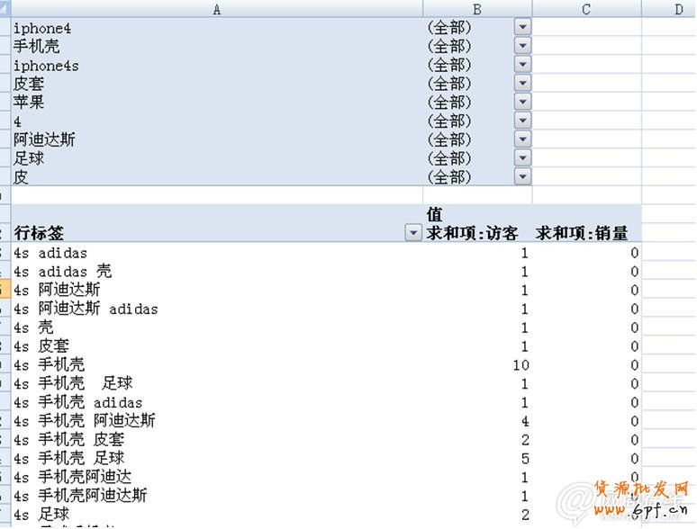 然后你在右邊繪制一個(gè)表格,把關(guān)鍵詞、訪客、銷量、轉(zhuǎn)化率排列好,每個(gè)關(guān)鍵詞的制作都要恢復(fù)到全部數(shù)據(jù),在篩選打勾。