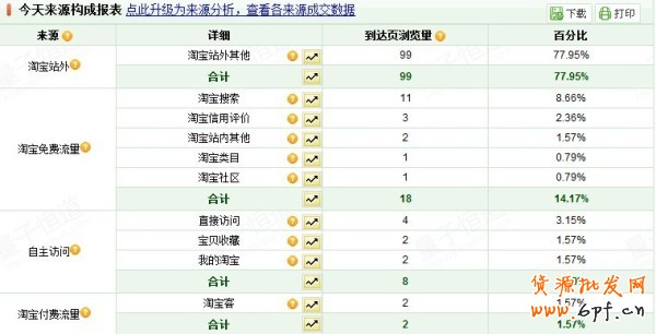 像這張表顯示,顧客進來的渠道有好幾個,有的來自站外,有的是搜索進來,有的是看淘寶信用評價進來。淘寶搜索進來最為重要,這類顧客一般購買欲望比較強,轉化率比較高。這項數據多了,說明品牌的知名度高,標題優化得不錯,人家是沖著您的牌子或者熱搜的關鍵詞而來。相反如果這項數據少了,一定就是品牌的力度不夠或者標題優化不好,要找原因從這下手。而從淘寶站外其他進來的,說明這站外推廣還是有影響力的。