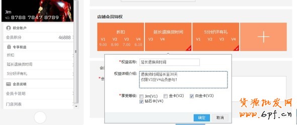 如:設置權益名稱----延長退換貨時間,設置權益詳細介紹-----退換貨時間延長至30天,僅限V3及V4會員參與,勾選會員等級----白金卡(V3),鉆石卡(V4)