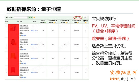 在量子恒道中,有一項(xiàng)“寶貝被訪排行”的功能,我們可以在這里獲取我們需要的數(shù)據(jù)。對于剛上架不久且零銷量的寶貝,建議選取的數(shù)據(jù)維度:PV、UV、平均停留時間,這些數(shù)據(jù)維度都是“往上走”的,帶有降序性質(zhì);最后還要單獨(dú)分析寶貝的跳失率。如果某款寶貝的總分值較低,而跳失率得分較高,說明這款寶貝的內(nèi)頁需要進(jìn)行重點(diǎn)優(yōu)化。