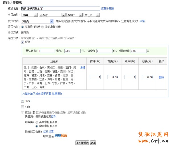 那么這時候我們在來修改一下這里面的一些參數,前面我們數了一下地區有57個。當然遠遠不只57個,我們能看到的就大概57個左右。這時候我們就要建立57個運費模板,上面的方法我們復制了一個模板。同樣的方法 我們要復制大概一共57個模板。然后進行修改,修改的時候大家注意下細節