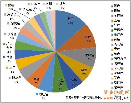 從顏色分布上看,最受歡迎的顏色為黑色占比13%,其次是白色(10%)軍綠色(8%)藍(lán)色和紅色(7%)等。