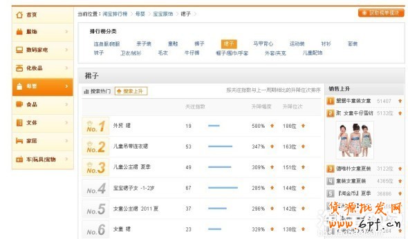 上圖就是淘寶排行榜的界面,選擇您經營的行業就會有詳細的類目可供選擇。比如說我選寶寶服飾,然后再選擇裙子,就會跳出一系列的買家搜索詞出來,在搜索上升和搜索熱門兩個類別中,挑選與自己經營的寶貝相關的詞進行組合,是不是很簡單呢?