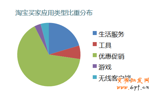 淘寶買家應用主要分為生活服務、工具、優惠促銷、游戲、無線客戶端五大類,其中優惠促銷類應用擁有600多款,生活服務類應用擁有200多款,兩者占據了80%的數量比重,具體如下圖。