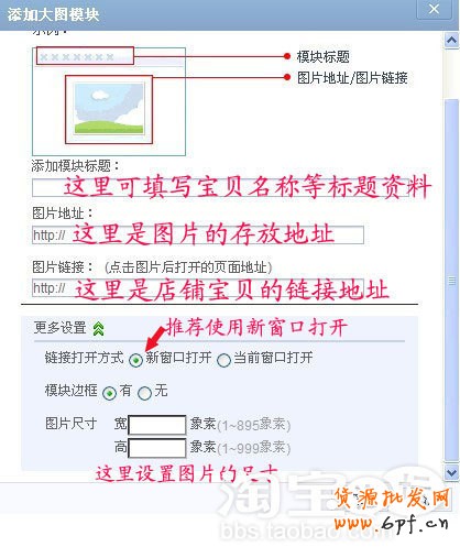 鏈接打開方式:理所當然選擇新窗口打開,這樣點擊圖片以后,會在一個新的窗口,打開您淘寶店鋪的詳情頁面!