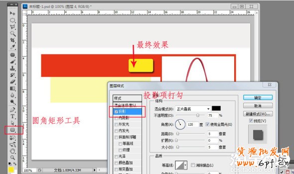 再新建圖層4,前景色換成黃色,這次用圓角矩形工具,在相應部位拉一個四角圓圓的圖形來,之后鼠標雙擊圖層4,出現圖層屬性對話框,在投影選項上打勾,確定,這是給"參團"兩個字作為背景.如圖