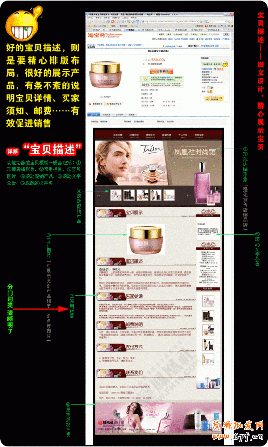 俗話說“人靠衣裝馬靠鞍”,產品宣傳同樣也要講究“包裝”,好的寶貝描述模板會有合理的布局構圖,精美的圖片裝飾,往往會讓產品增色不少,并且把固定出現的一些欄目都能井井有條的一一呈現,同時一般上方會不斷出現店鋪名稱和形象,讓顧客記憶深刻,營造良好的購物展示環境同時宣傳店鋪。