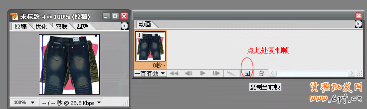 6、點(diǎn)下圖中動(dòng)畫窗口中的“復(fù)制當(dāng)前幀”(右邊第二的功能按鈕),連點(diǎn)兩下(因有三張素材,固三幀即可)