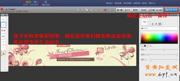 一切搞定,別忘了點(diǎn)保存!店招上可以顯示自己增加的動(dòng)態(tài)效果了!扶植版不花錢(qián)照樣做出淘寶動(dòng)態(tài)店招效果。