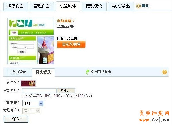 登錄“我的淘寶”—“我是賣家”—“店鋪管理”—“店鋪裝修”—“設置風格”—“自定義編輯”即可設置頁面背景和頁頭背景,頁面背景設置如下圖: