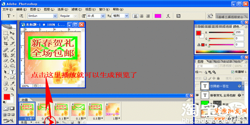 第四個步驟:加入文字如(僅限前一百位)。在這里要講的是為什么不與第三步一氣呵成呢,因為我們這里的PS動畫是通過圖層的交替顯示來產生的效果,為了產生我們需要的效果,所以這里要在新的圖層重新操作輸入。