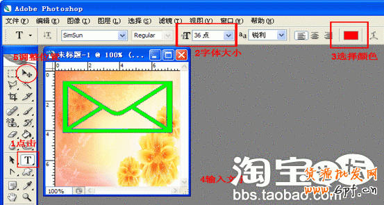 1.點擊橫排文字工具,選擇字體大小和顏色,然后輸入文字,可以用移動工具調整字的位置到信封中間: