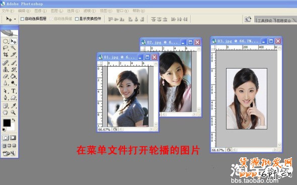 1.在網上搜索下載的,選了三張圖片圖片素材啦!好下面打開PS軟件在菜單文件下拉打開要做輪播的圖片