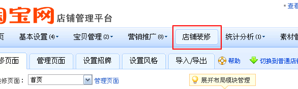 第一步:在店鋪首頁右上角點 “管理我的店鋪” 進入管理平臺,點擊 “店鋪裝修”