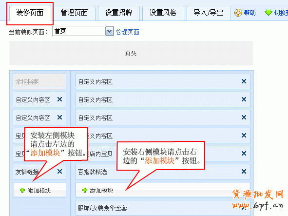 第二步A:點擊左側(cè)的 “裝修頁面” 出現(xiàn)模塊操作區(qū)。模塊操作區(qū)分類左右兩欄,左欄添加左側(cè)模塊,右欄添加右側(cè)模塊。此時點擊 “添加模塊” 。