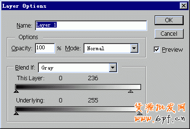 12、在面板中的“Layer 1”層上單擊鼠標右鍵,在彈出的菜單中選擇“Layer Option…”,在對話框中把“This layer”下的滑塊向左移動一些使值變?yōu)?36,點擊“ok”按鈕制作完成。