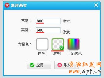 彈出新建圖片的尺寸,設置好尺寸寬為800 高度600,背景顏色選擇透明,然后點應用。