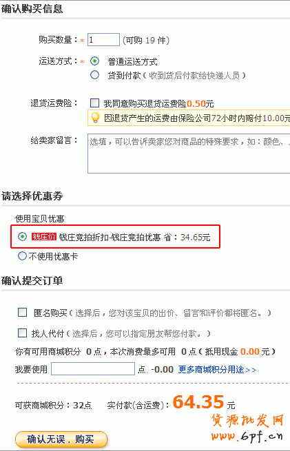 5.填寫完整收貨地址、運送方式、給賣家留言等相關信息,最后點擊“確認無誤,購買”按鈕。