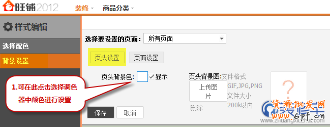 點擊”背景設置“ --”頁頭設置“進店招位置的背景設置