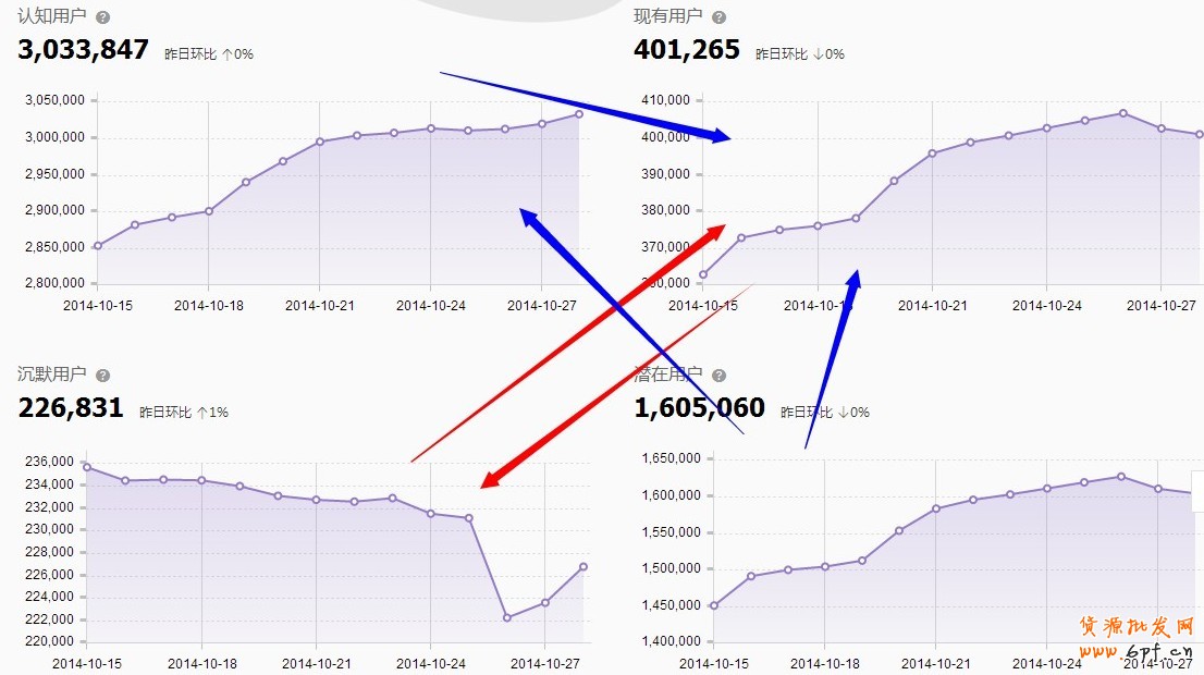 見上圖DMP四層用戶分析,要分析四層用戶之間的關系。總體來說,在重點預熱期,認知用戶的曲線應該上升。雙11前轉化是下降的,現有用戶可能會下降,但是不同店鋪情況是不一樣的,潛在用戶的曲線可能是上升。
