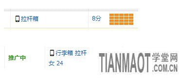 上面2個圖方格子都是滿格,但關鍵詞“拉桿箱”質量得分是8分,“行李箱 拉桿 女 24 ”的質量得分是10分,這也是因為兩個詞的競爭度不同導致的。一般情況下,大的類目詞競爭度較大,所以質量分會難以優化到10分。而中長尾詞因為購買推廣的商家相對較少,所以質量分較高且容易優化到10分。