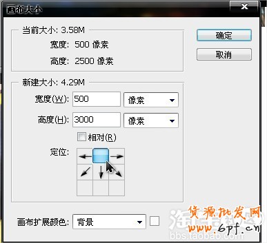 在這里面可任意調整畫布的寬、高,我把高度改為3000像素,注意一下定位,如果默認中間定位,那么修改后的高度會上下同時增加,因為之前添加了不少圖片,現在只是底部需要加長,所以定位的小方塊選擇在頂部。頂部不動,底部加長