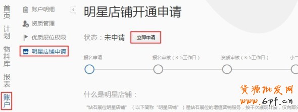 從我的推廣——鉆展進入后臺,點擊賬戶——明星店鋪申請——立即申請