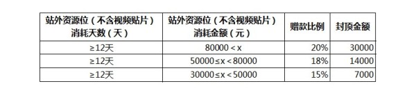 活動規則:活動期間在鉆石展位站外資源位的消耗天數≥12天,且消耗金額達到標準,即可獲得相應比例的贈款。