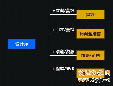文字功底扎實(shí),具備營(yíng)銷思路的可以轉(zhuǎn)型做策劃;口才一流,又掌握營(yíng)銷手段的,可以轉(zhuǎn)型做顧問型銷售;有供應(yīng)商和媒介資源的可以轉(zhuǎn)型做市場(chǎng)或者企劃;有一定程序開發(fā)能力的或者前端架構(gòu)的,可以轉(zhuǎn)型產(chǎn)品經(jīng)理;還有更多種不同的組合,而決定它的是設(shè)計(jì)師所擁有的知識(shí)。
