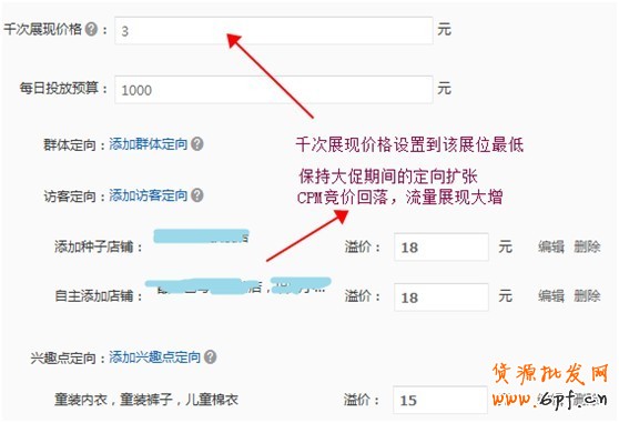 1、 定向,可以訪客定向和興趣點(diǎn)定向?yàn)橹鳎ㄗh現(xiàn)階段CPM價(jià)格低的時(shí)候,用更少的錢買到更多的流量,可保持大促期間擴(kuò)大定向的范圍,請(qǐng)注意點(diǎn)擊率反饋,持續(xù)保持去差留優(yōu)~