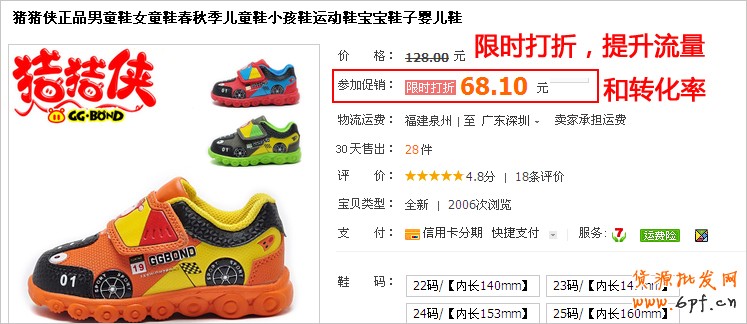 價 格對流量影響非常大,對于童鞋一說,價格太高,家長們可能不愿意在網上買,在實體店中都能買到;價格太低?又怕質量不好,孩子穿著不舒服,現在的孩子多精 貴,誰都希望能在網上買到價格實惠,質量又好的鞋子。利用這個心理,我在店鋪里面,用工具設置了”限時折扣“的價格優化活動,高價位,高質量,低折扣…… 呵呵,讓買家有撿便宜的感覺。如下圖: