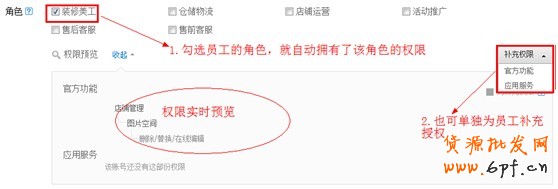 如圖6,根據(jù)店鋪里所有員工的工作職能,設(shè)置相應(yīng)的角色,比如客服、運(yùn)營、美工、倉儲等,并給角色授予不同的權(quán)限。
