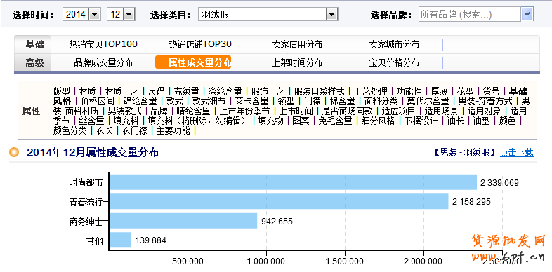 2、屬性成交量分析:明確好子類(lèi)目后,那么款式又要選什么樣的,又是一個(gè)難題...屬性成交量分布對(duì)市場(chǎng)熱銷(xiāo)寶貝屬性進(jìn)行了相對(duì)完善的統(tǒng)計(jì),比如風(fēng)格,材質(zhì),適用對(duì)象等,通過(guò)這些數(shù)據(jù),明確市場(chǎng)需求,結(jié)合店鋪定位,確定寶貝款式。