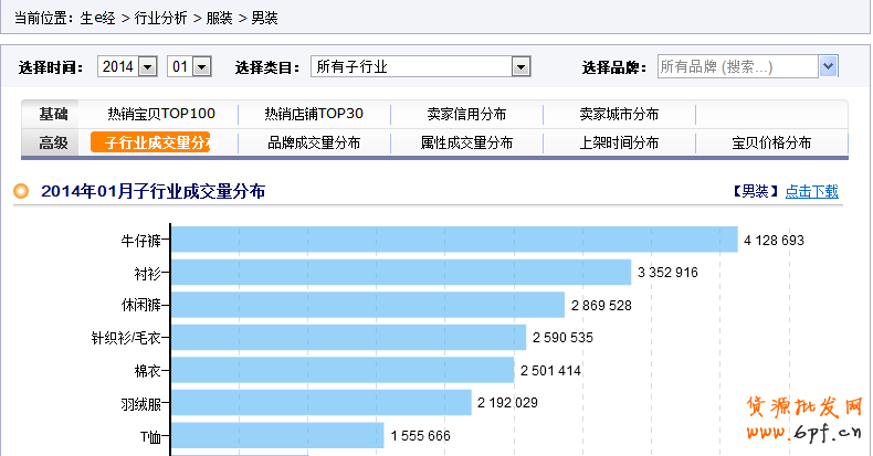 1、子類(lèi)目數(shù)據(jù)分析:選取店鋪主營(yíng)類(lèi)目,從子類(lèi)目分析哪些是應(yīng)季寶貝(建議參考去年同時(shí)段數(shù)據(jù),以便提早確定貨源)。例如從下面截圖可以分析,不同的月份熱銷(xiāo)寶貝是不一樣的,1月相對(duì)熱銷(xiāo)的是牛仔褲,襯衫,而8月份相對(duì)熱銷(xiāo)的是T恤,休閑褲,因此我們?cè)趽Q季時(shí)需要以行業(yè)數(shù)據(jù)尋找合適的寶貝,才能更加符合市場(chǎng)的購(gòu)買(mǎi)需求。