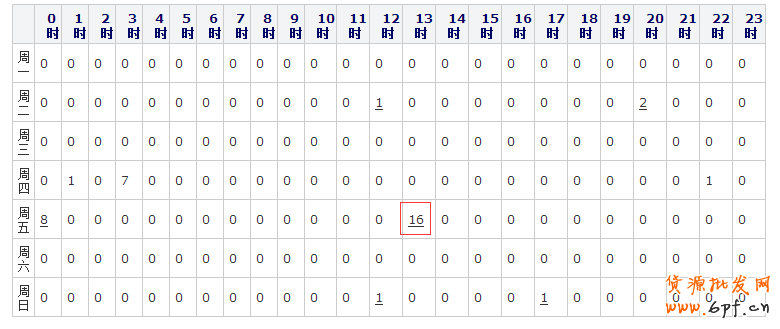 從下圖可以清晰看到,目前店鋪寶貝一個(gè)星期不同天數(shù)以及不同時(shí)間段的分布,該店鋪寶貝大部分集中在周五13時(shí)這個(gè)時(shí)間段基本沒(méi)寶貝分布,這樣過(guò)于集中的分布,會(huì)導(dǎo)致店鋪一周內(nèi)流量極度不均勻,寶貝在下架日的流量也會(huì)相互競(jìng)爭(zhēng),影響了店鋪流量的均勻分配,所以合理分配是必須的。