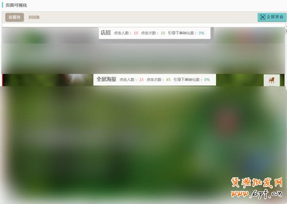 “頁面可視化”則直觀地用圖片展示的方式來說明店鋪的點擊人數、次數及轉化率的情況。更能直接反應店鋪出現問題的原因。如某一模塊,擺放位置很好,而點擊人數卻很少,則說明可能圖片質量不好;如某些重要圖片而質量也很好,但點擊人數不多,則說明可能位置擺放不正確;若某個模塊點擊率很高,而引導下單轉化率很低,則說明可能擺放的寶貝不太受歡迎。當然,除了按模塊分析,也可以按鏈接分析。圖片左上方就可以直接點擊“按鏈接”即可顯示頁面內每個鏈接的“點擊數次數”或“點擊人數”,從而能更好完善頁面,。