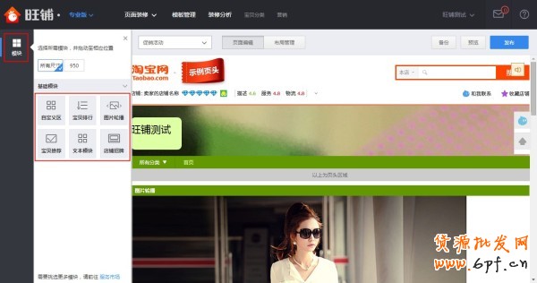 點擊左側工具欄“模塊”,展開模塊列表。該頁面可添加:店招、寶貝推薦、寶貝排行、圖片輪播、文本模塊5種模塊。(注:自定義內容區不可以拖拽到頁面主體區域,只有專業版旺鋪的用戶才可以在頁尾區域添加自定義內容區。)