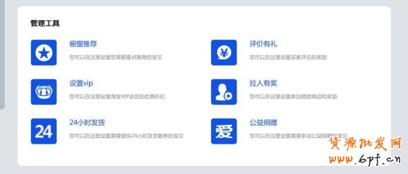 原有的櫥窗推薦、VIP設(shè)置、愛心捐贈、回收站、歷史寶貝、評價(jià)有禮、拉人有獎、24小時發(fā)貨、體檢中心等功能現(xiàn)在全部作為單獨(dú)的功能組件提供服務(wù),可以在寶貝管理首頁找到入口。