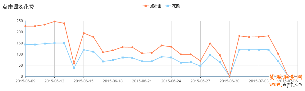 它的使用很簡單,只要我們把熱銷寶貝選中,設置好日限額,一鍵推廣就可以了。經過一段時間的推廣,可以從后臺數據看出點擊和花費的折線圖,數據一目了然。
