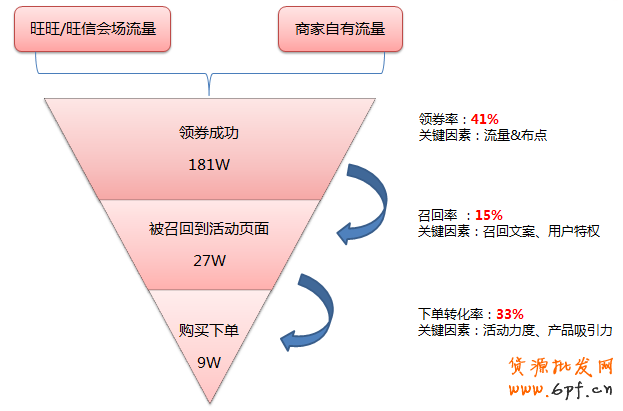 以618數碼電器城年中大促為例,入場券整體活動會場的流量近500萬,參與活動的商家總體領券量為181萬,會場總體領券率41%,總體的召回量27W,總體召回轉化率高達15%。